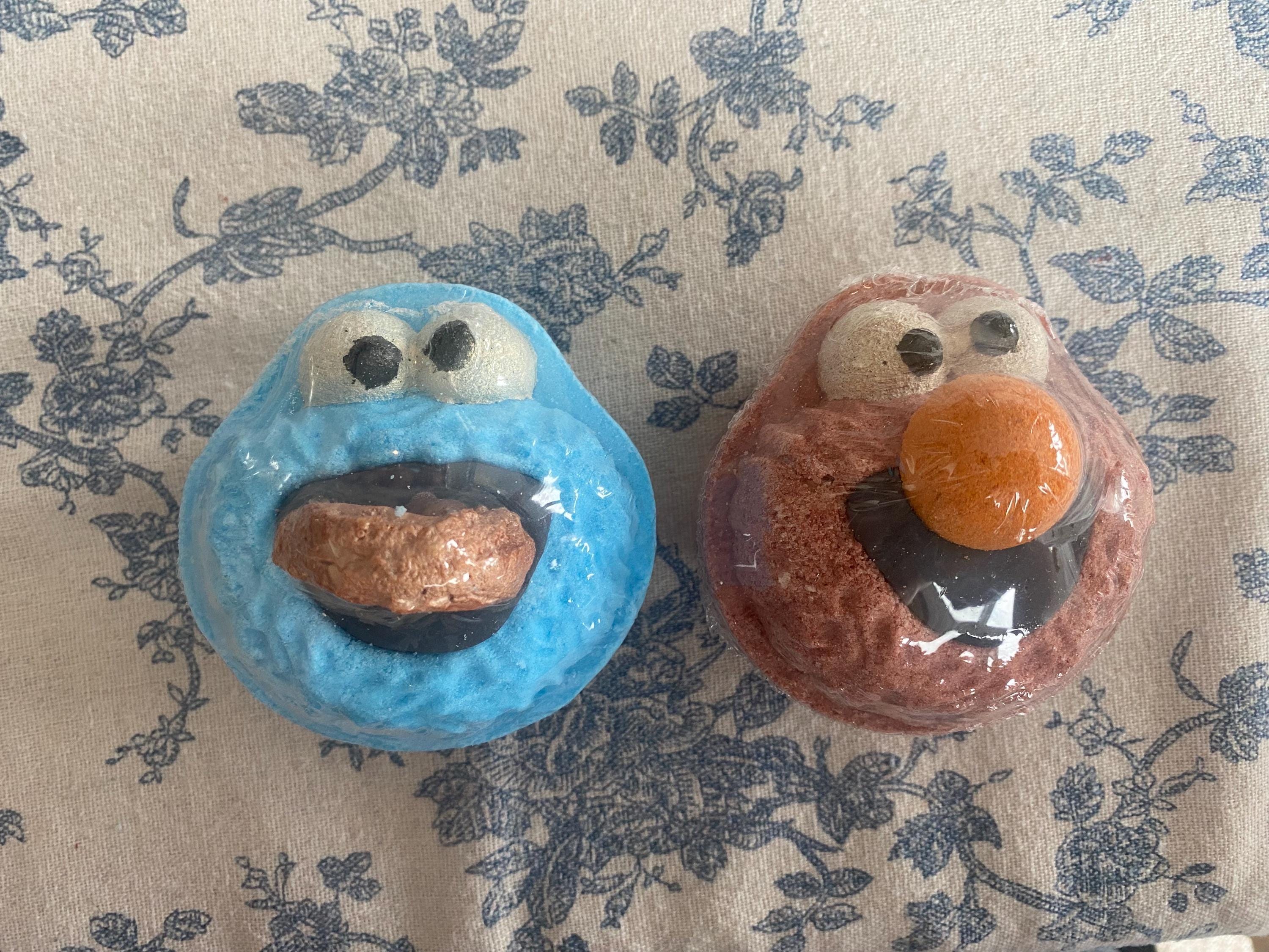 This bath bomb is made to look like Cookie Monster with a chocolate chip cookie in his mouth or Elmo. The Cookie Monster bath bomb is scented in chocolate chip cookie. The Elmo bath bomb is scented in Monkey Farts (banana/bubblegum) Each bath bomb is made with