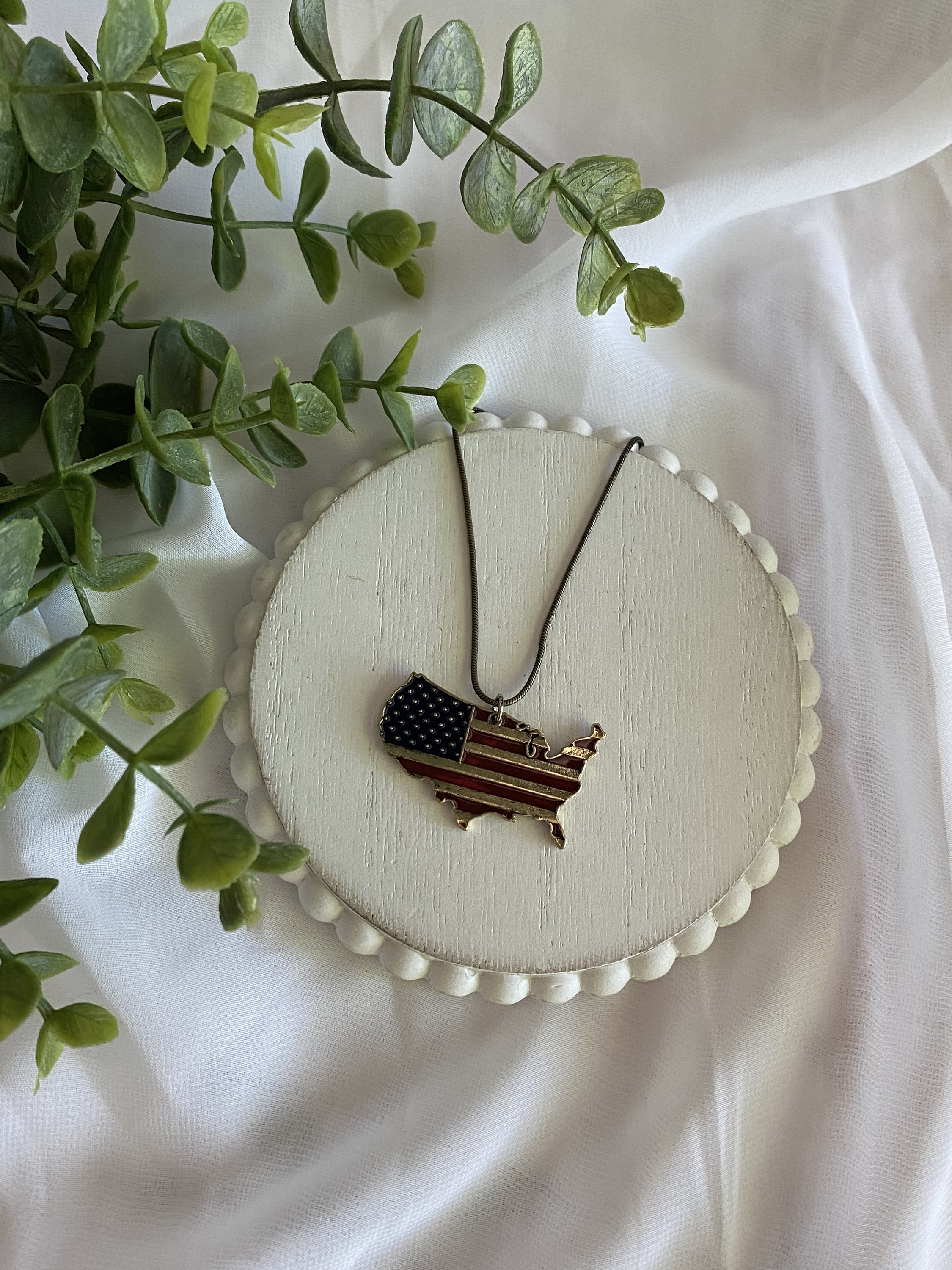 This necklace is made with a 16in. antique gold colored chain, antique gold colored USA map charm, and red and blue enamel paint.