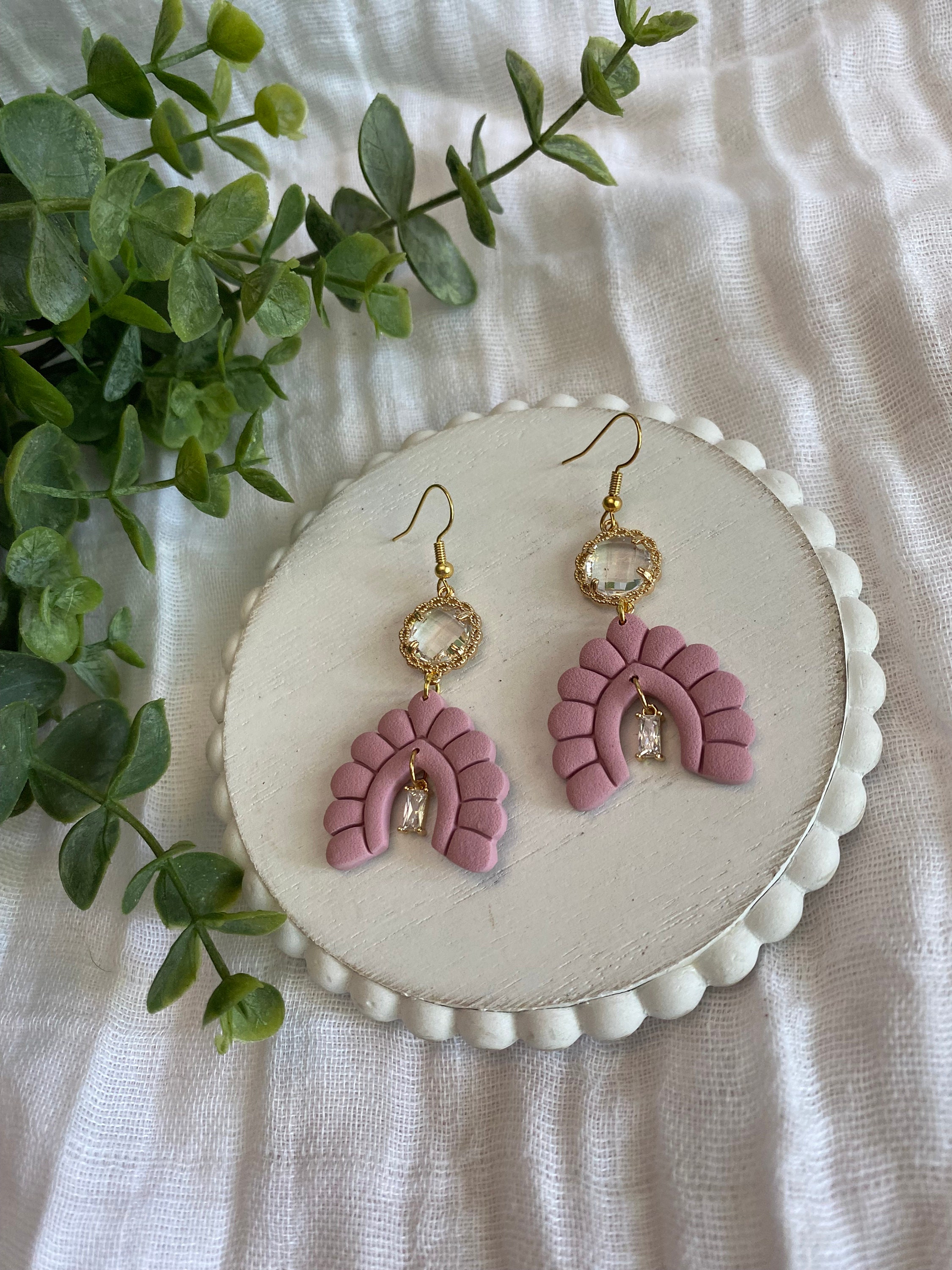 This pair of earrings is made with dusty pink clay, gold colored hooks, and gold colored charm with crystal rhinestones. The clay part is flexible but I do not recommend purposefully bending it because it may cause damage.