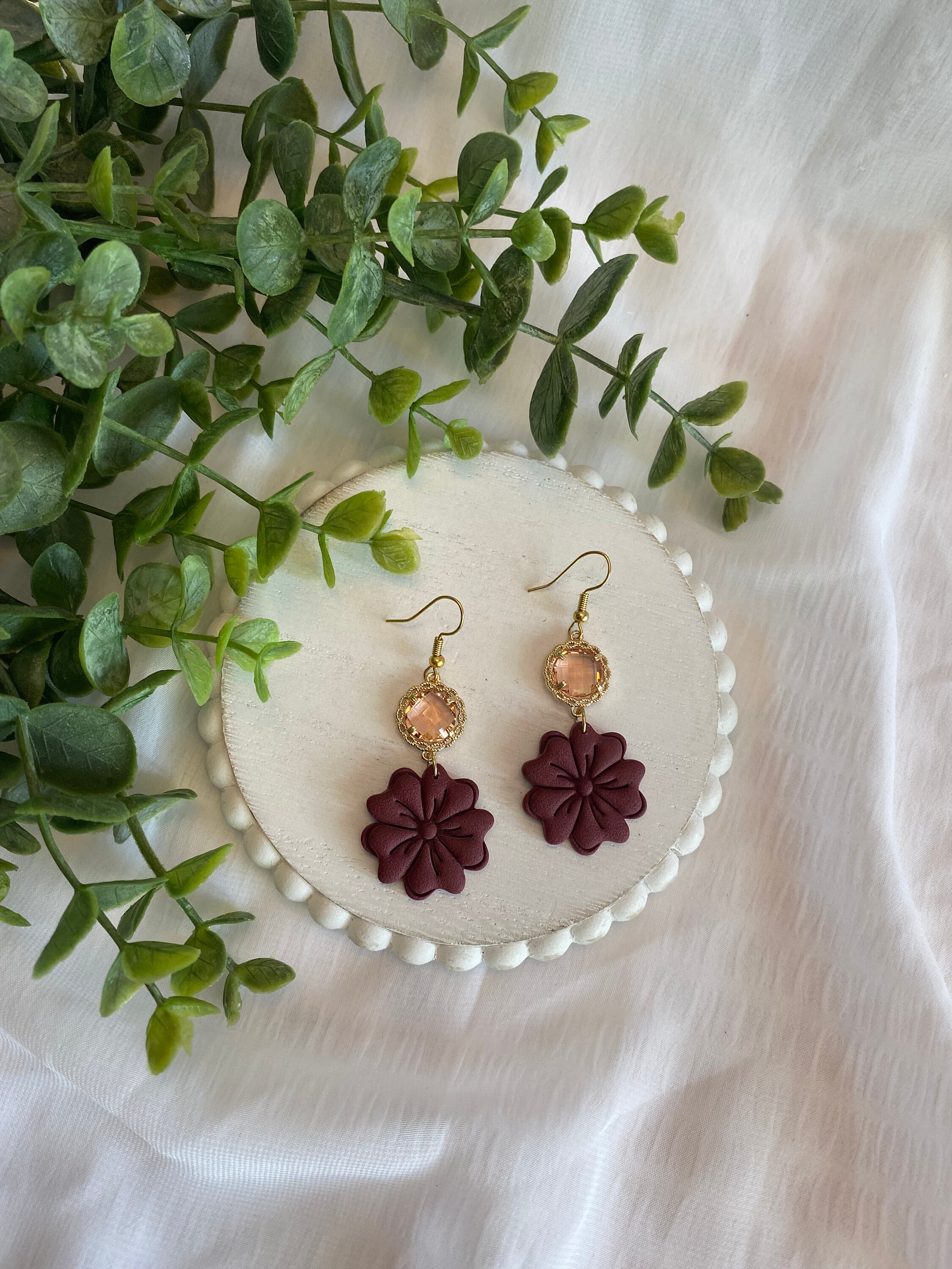 These earrings are made with burgundy clay, gold colored hooks, and gold colored charm with a pink crystal.