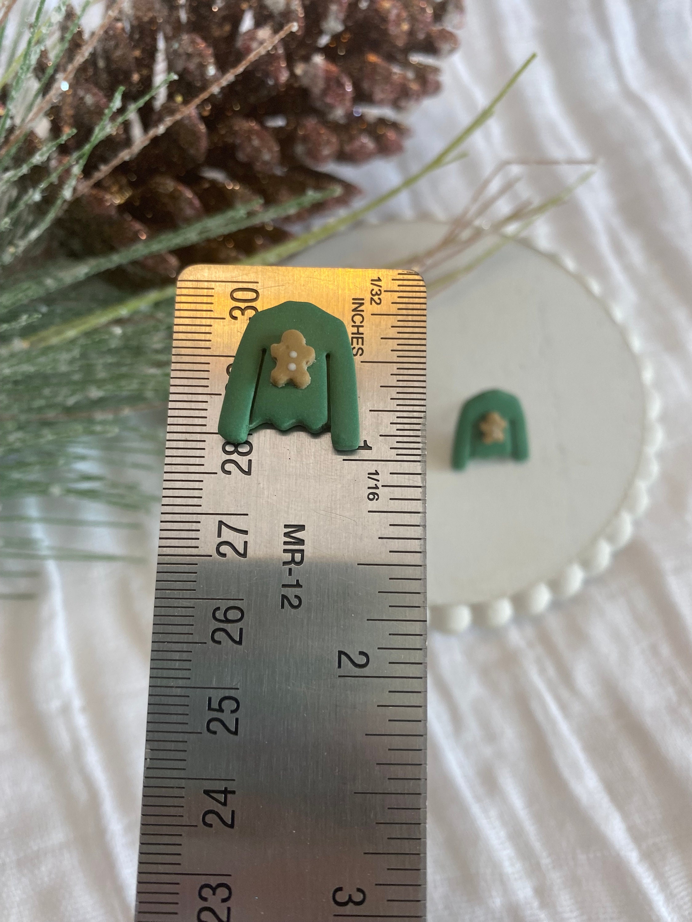 These earrings are made with green and tan clay, white paint, and silver colored posts.