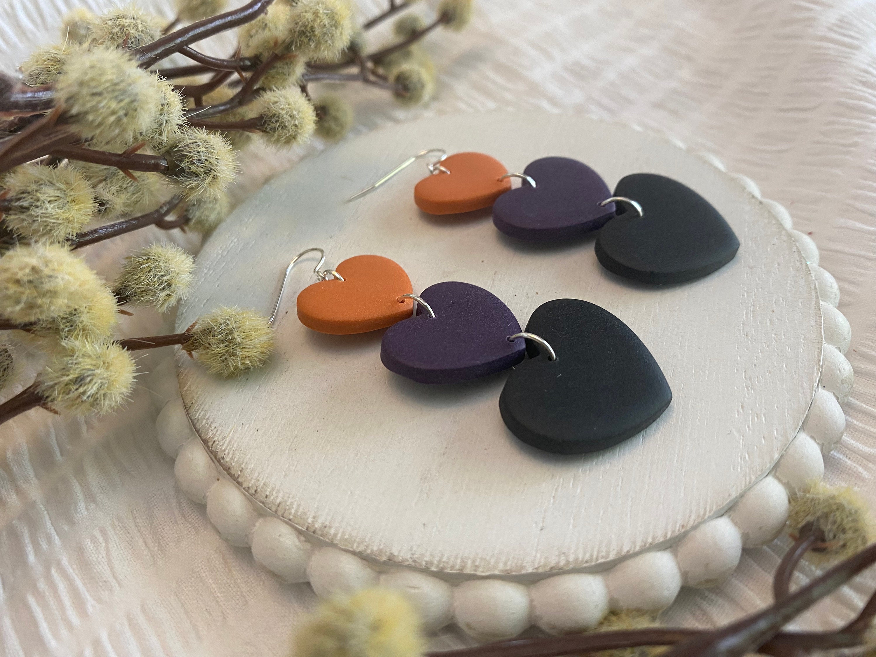 These earrings are made with orange, black, and purple clay and silver colored earring hooks.